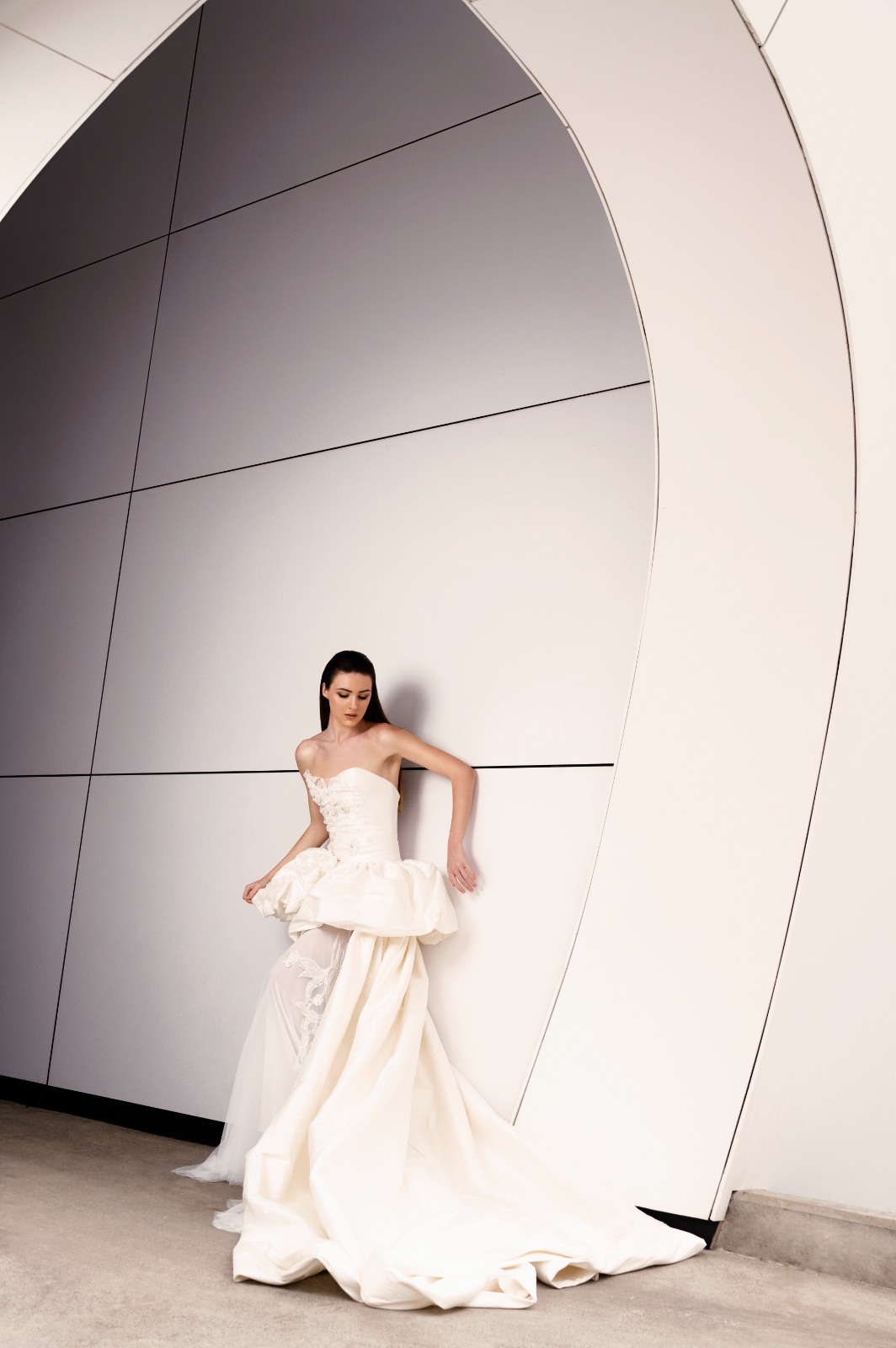 La firma Marco & María volverá a cautivar al sector con su colección “Miradas”, una propuesta para 2027 donde los diseñadores Marco Marrero y María Díaz exploran la idea de que la realidad se transforma según los ojos que la observan. En esta línea de trabajo, el concepto de “lujo silencioso” cobra vida a través de detalles minuciosamente trabajados y brillos sutiles que aparecen y desaparecen con el movimiento. Las piezas destacan por la ausencia de cortes de continuidad, naciendo cada vestido de una emoción o un estado de ánimo concreto. La utilización de tafetanes bordados en algodón, nidos de abeja sobre tul y plumeti, junto a rebrodés de aire vintage confirman el sello inconfundible de una firma que ha construido una identidad prestigiosa en los mercados más exigentes del mundo.